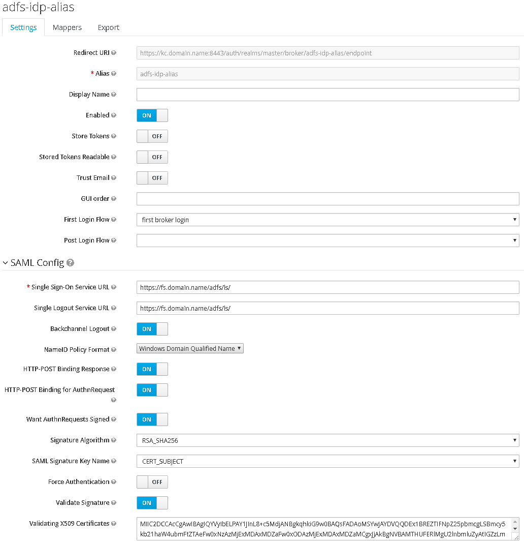 Keycloak server has configured for SSL/TLS transport - this is mandatory for AD FS to communicate with it. This comprises two steps:
