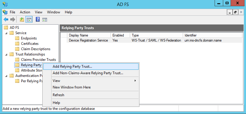 In AD FS Management console, right-click Trust relationships → Relying Party Trusts and select Add Relying Party Trust from the menu: