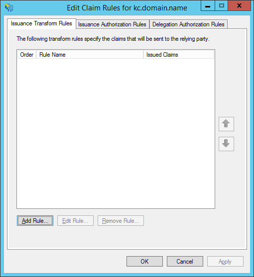 We will set up three rules: one for mapping user ID, second for mapping standard user attributes, and third for a user group. All start by clicking the Add Rule button in the Edit Claim Rules for kc.domain.name window: