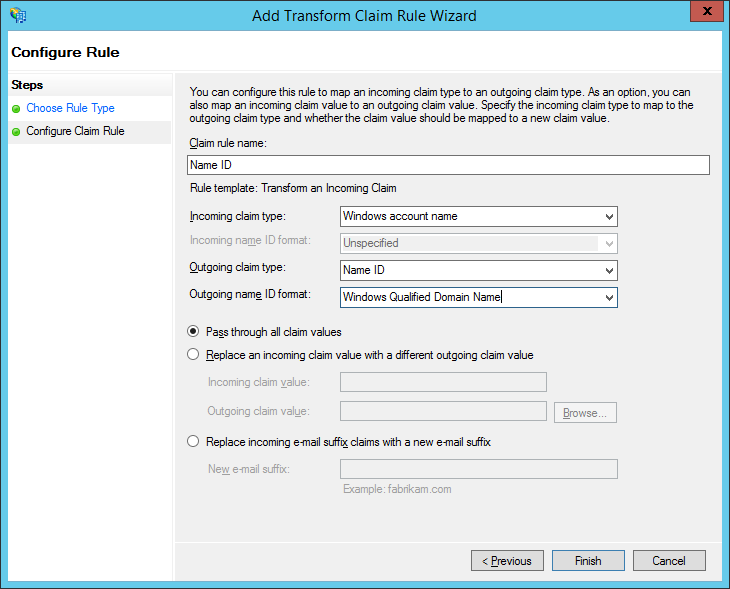 The first rule will map user ID in Windows Qualified Domain name to the SAML response. In the Add Transform Claim Rule window, select Transform an incoming claim rule type:
