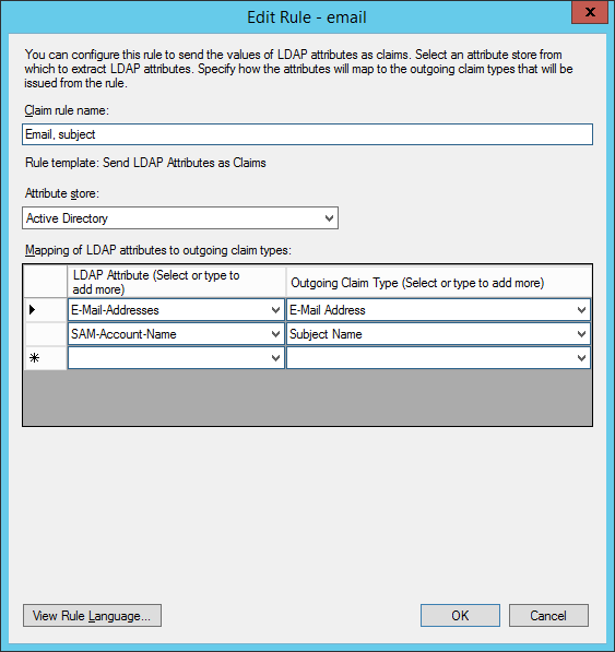 The second rule will map user e-mail to the SAML response. In the Add Transform Claim Rule window, select Send LDAP attributes as Claims rule type. You can add other attributes as needed: