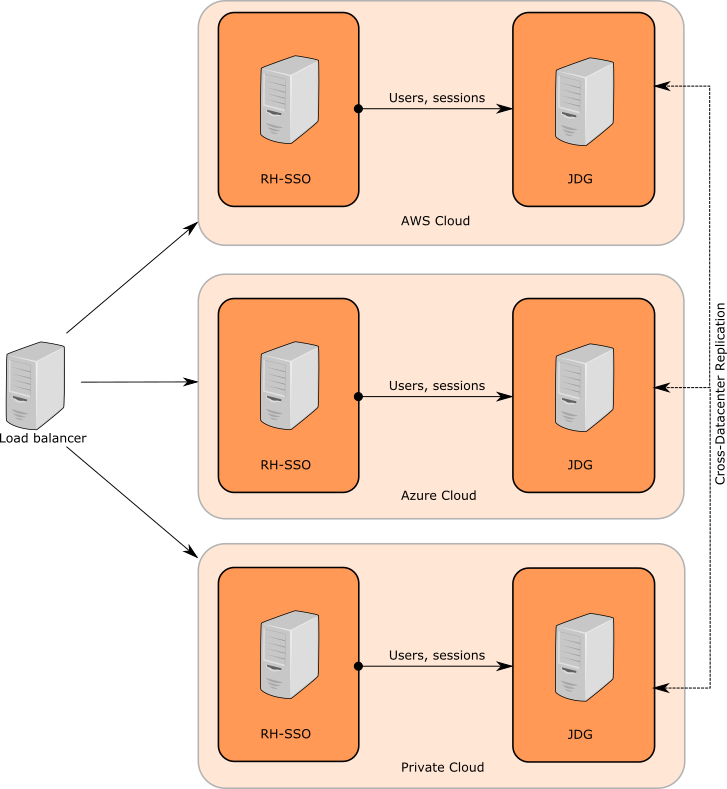With this setup, every cloud is aware just about the users and sessions created on itself. This is fine with sticky session, but it won’t work for failover scenarios in case if one of the 3 clouds is broken/removed. There are also other issues with it - for example that admins and users see just sessions created on particular cloud. There are also potential security issues. For example when admin disables user on one cloud, user would still be enabled on other clouds as changes to user won’t be propagated to other clouds.
