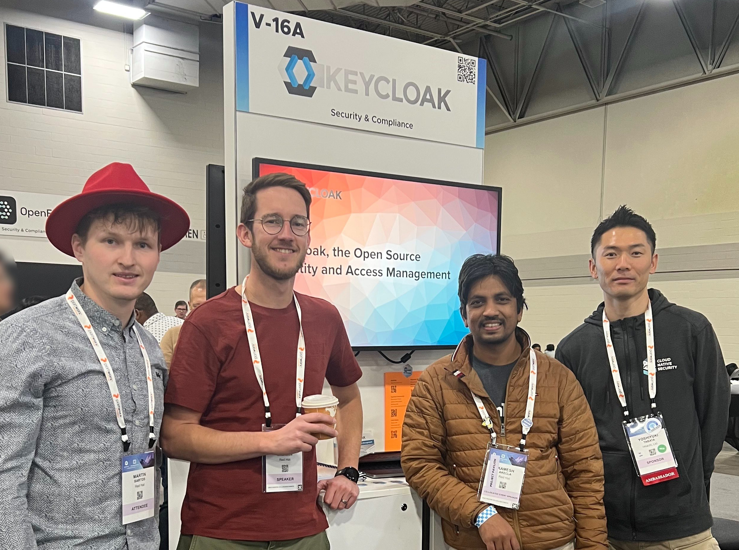 Keycloak hosted a project pavilion stand during Wednesday, Thursday and Friday afternoon slots. Attending the booth were Keycloak contributors Yoshiyuki Tabata from Hitachi and Ryan Emerson, Martin Bartos and Kamesh Akella from Red Hat.