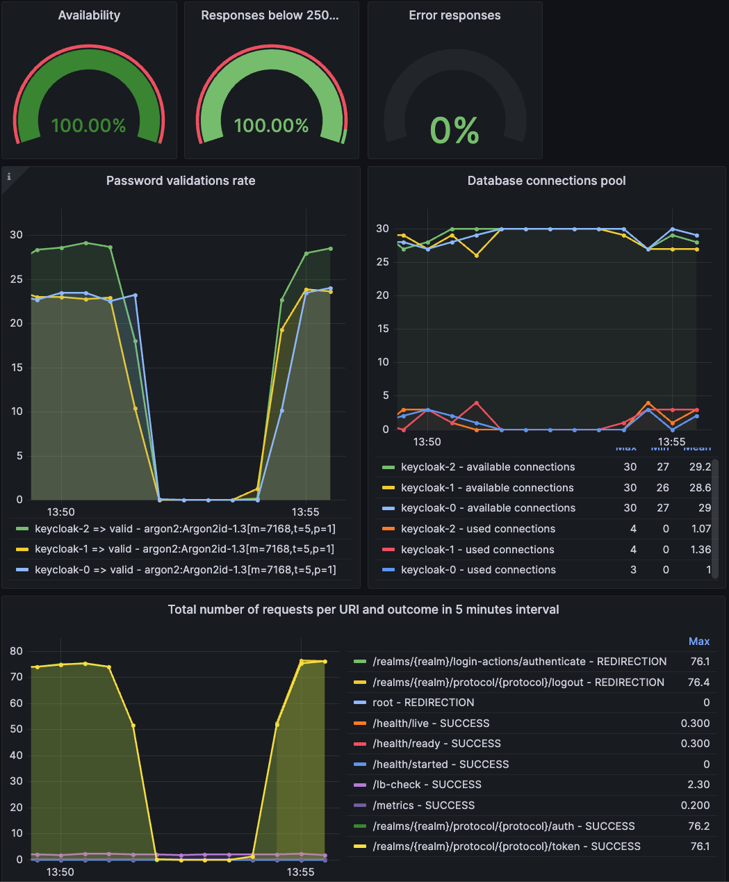 Users rely on Keycloak to log in to their applications, and service level indicators (SLIs) capture the key metrics capturing that behavior. Misbehavior of the system can be detected by monitoring these SLIs.