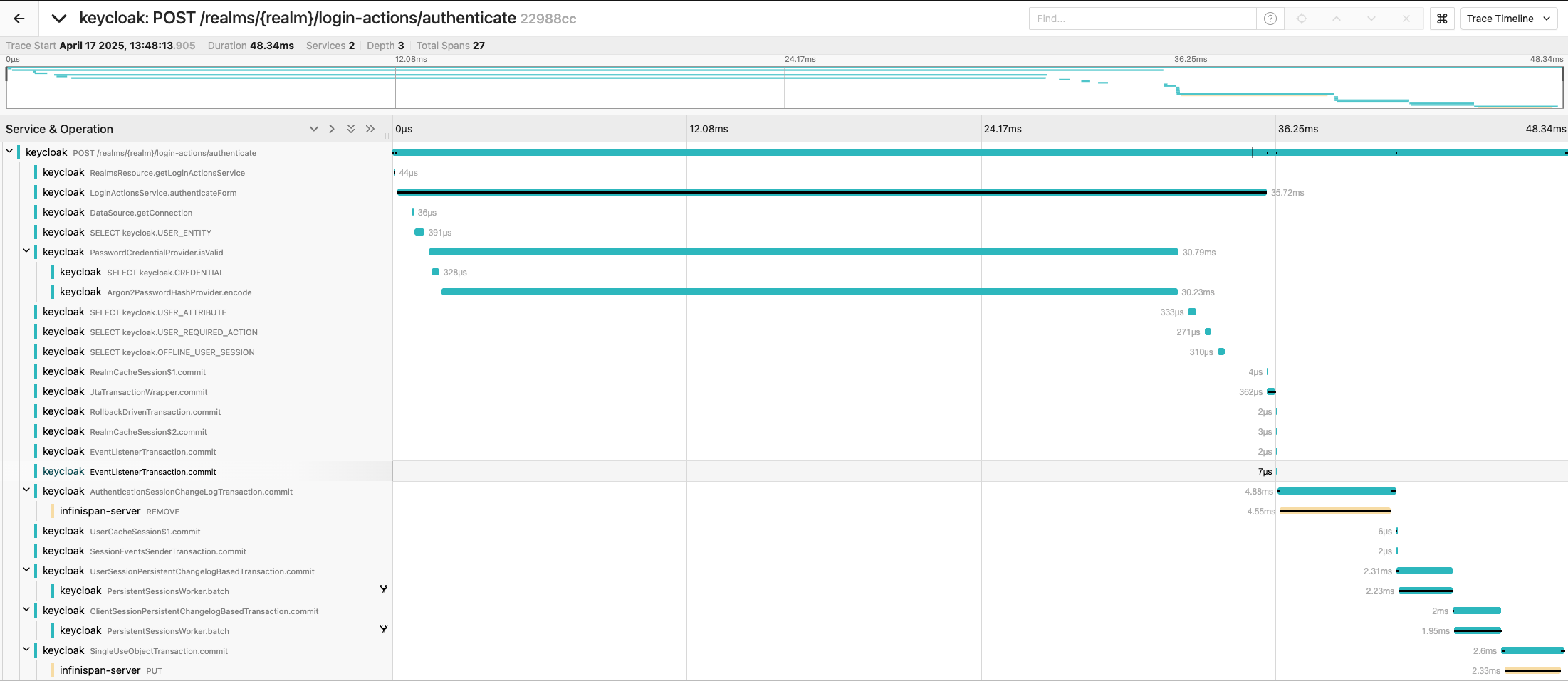 In the example below, you can see steps Keycloak was performing when a user submitted the username and password form. You can see the most time-consuming step was password hashing, which took 30 milliseconds out of 48-millisecond total request processing time.